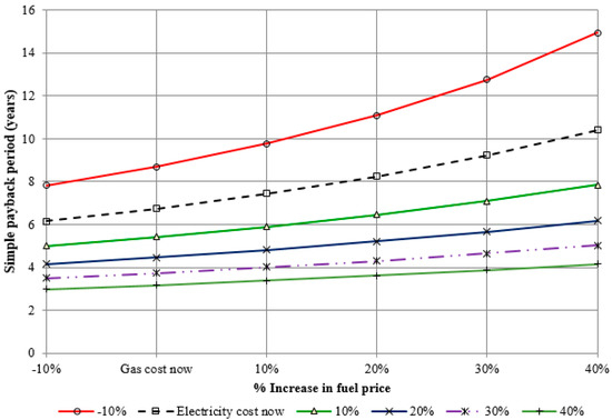 To investigate the effect of such future fluctuations in the electricity and fuel prices, the LSBU model performs a sensitivity analysis of the payback period by considering the future variations in the electricity and fuel prices in the range between −10% and +40%. The results are presented in Table 4 and Figure 14.