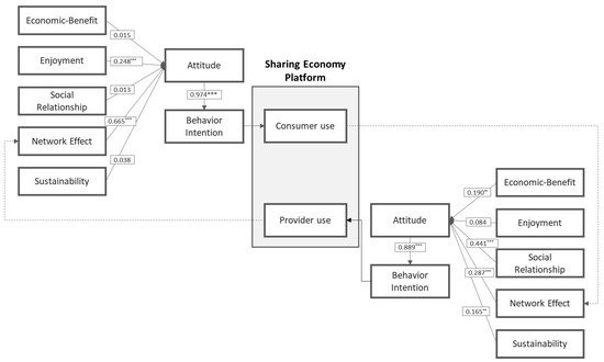 The assumption that economic benefit and social relationship will affect the intention to use is not supported, and enjoyment has a positive effect. Hamari et al. suggested that that the expected economic benefits do not affect attitudes [33]. Hawlitschek et al. showed that the income variable did not affect the intention to use in terms of consumers but did have an effect on the provider perspective [20].