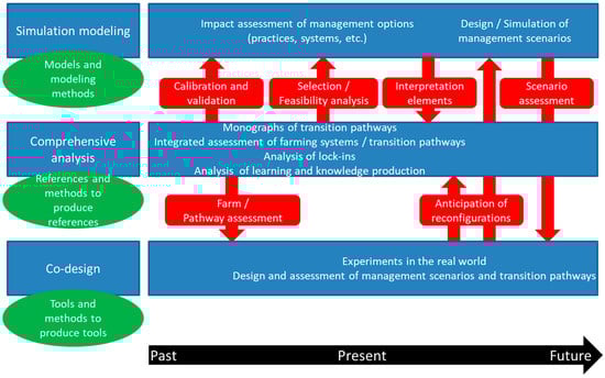 Following Turnheim et al. [21], we believe a need exists to take advantage of the multiple views and approaches of agricultural science to better understand and support the sustainability transition of farming systems, which is as a complex, multi-dimensional and uncertain process. Three approaches that encompass different stances and methodological choices are considered key (Figure 1): comprehensive analysis, co-design, and simulation modeling. Each represents different viewpoints (constructivist vs. objectivist, past and present vs. projected) of the sustainability transition of farming systems and of factors that are critical to the transition. We posit that these three analytical perspectives are not incompatible and that they can and must be articulated to address transition issues. All three approaches adopt a systems perspective of the transition [22] and involve integrated assessment of farming systems, i.e., “the scientific ‘meta-discipline’ that integrates knowledge about a problem domain and makes it available for societal learning and decision making processes” [23].