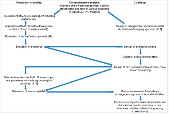In both case studies, comprehensive analysis was the starting point, performed before simulation modeling or co-design. It improved understanding of the problem situation, which is necessary to develop simulation models or facilitate the co-design approach [49]. As already suggested [107], co-design was strongly related to simulation modeling: simulation models played a key informative role during co-design. In particular, from farm to regional levels, costs of information gathering may be high, and sometimes that information may have low reliability due to measurement difficulties. Simulated data can provide stakeholders with information they have not encountered in current farming systems or in co-designed scenarios. Thus, simulation models enabled participating stakeholders to deepen their search for solutions for the sustainability transition [18]. These models also promoted social learning about pros and cons of scenarios involving a range of stakeholders, whether for agricultural water management or for crop-livestock integration beyond the farm level.