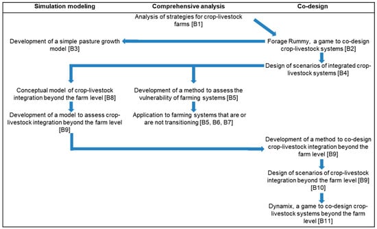 Overview of the articulation over time (from top to bottom) among the three research approaches for the example of autonomy in crop-livestock systems. B1, B2, etc. refer to the outputs of the research listed in the text.