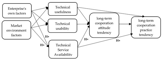 The more technology services that enterprises can get from universities, the more likely they are to participate in the long-term technology transfer activities of universities, and the more likely they are to make practical technology transfer transactions [31]. The higher the enterprise’s availability of the university technical service, which is a complementary product, the higher the enterprise’s expected utility and the greater the enterprise’s expected return of the technology transfer, and the more they inclined they are to maintain a positive and active trading attitude, make trading decisions, and pay the actual behavior [32]. Much of the literature suggests that the availability of complementary products will directly affect the consumption attitude and consumption decisions that surround the system products [33,34]. For example, studies that examined the consumer’s consumption decisions in the mobile communication market have found that the quantity of complementary products expected by consumers would significantly affect consumers’ consumption decisions on new products [35]. Therefore, the following assumptions are put forward:
