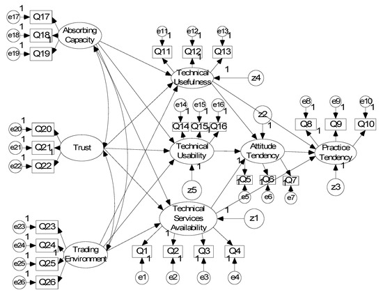 The above analysis results show that the original structural model needs to be further modified and perfected. In the structural model, the direct impact of technical usefulness on attitude tendency and the direct impact of trading environment on technical usefulness, technical usability, and technical services availability are not significant, so we need to delete them and implement the modification of the model. Therefore, the four influence paths mentioned above are deleted from the structural model to form a modified model. The modified model is refitted to fit the path coefficient and the goodness-of-fit test, as shown in Table 7.