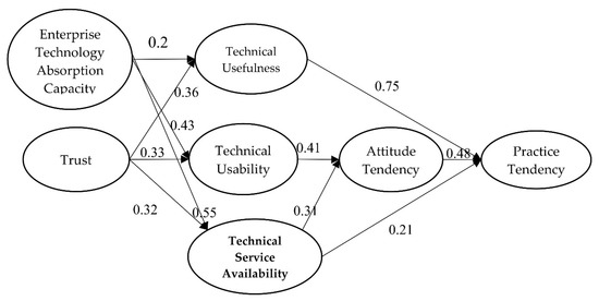 Enterprise technological absorptive capacity has a significant positive impact on technology usefulness, technical usability, and the availability of technical services, and the path coefficients are 0.23, 0.43, and 0.55, respectively. Trust has a significant positive impact on technology usefulness, technical usability, and the availability of technical services, and the path coefficients are 0.36, 0.33, and 0.32, respectively. That is to say, enterprise technology absorptive capacity and trust influence long-term cooperative practice tendency by influencing technical usefulness and technical service availability, and also influence long-term cooperative attitude tendency by influencing technical usability and availability of technical services.
