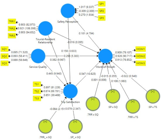 Figure 2 shows the results of PLS analysis and Table 4 summarizes the results of PLS analysis that perceived service quality has significant positive effects on trip satisfaction and WOM, and trip satisfaction has a significant positive effect on WOM. The results also indicate that the tourist–resident relationship has a direct and positive effect on trip satisfaction. It also shows the moderating effects on the relationships between service quality and trip satisfaction and between trip satisfaction and WOM. The safety perception is shown to have a direct and positive effect on trip satisfaction and WOM. It also shows a moderating effect on the relationship between service quality and trip satisfaction. The values of R-squared of trip satisfaction and WOM are 0.636 and 0.728, so a high percentage of variance is explained by the model. For the significant direct effects of the tourist–resident relationship and safety perception on trip satisfaction and WOM, the effect size f-Square values are ranged from 0.052 to 0.306. These results indicate these effects are ranged from small to large effects []. For the significant moderating effects, the effect size f-Square values are ranged from 0.013 to 0.022. These effects are counted as small effects [].