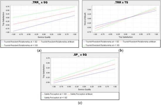In order to understand the moderating effects of the tourist–resident relationship and safety perception, a simple slope analysis is performed and the results are shown in Figure 3. Figure 3a,c indicate that those tourists who have a high tourist–resident relationship or perceive high safety conditions are more satisfied with the trip than those who have a low tourist–resident relationship or who perceive low safety conditions when they experience the same level of tourism services. Figure 3b indicates that those tourists who have positive trip satisfaction and perceive a high tourist–resident relationship would have a stronger intention to pass on by WOM favorable views to their friends and relatives than those who have a low tourist–resident relationship. Hence, H1a, H2a, H2b, H3a, H3c, and H4a are accepted.