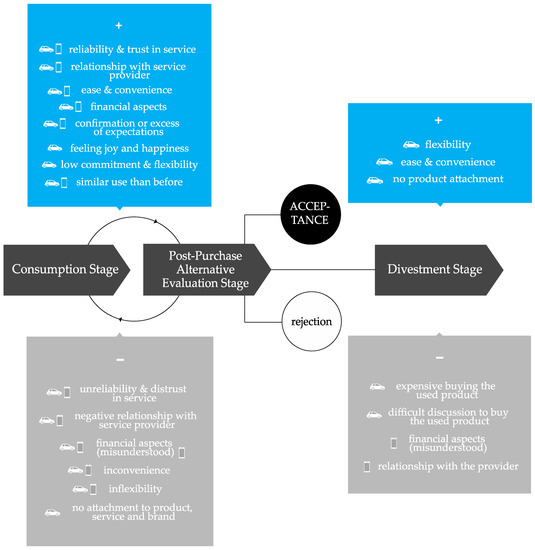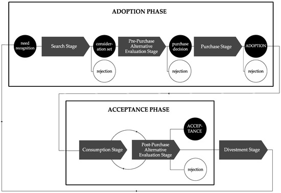 As visualized by black frames in Figure 1, we made a distinction between the adoption phase and the acceptance phase. This distinction was based on Meijkamp’s (2000) model distinguishing the adoption decision with respect to car sharing (which according to his categorization includes “informal arrangements”, “neighborhood systems”, “short-term systems”, “subscription systems”, “vouchers systems”, and “closed systems”), and the service quality perception after usage [15]. For the purpose of this study, we define the term ‘adoption’ as the psychological action of the consumer of selecting a certain service and making it possible for her/him to use the proposed service. The term ‘acceptance’ is used to describe the psychological action of credence in a service (including the product at its core). The nuance between adoption and acceptance is that adoption is based on expectations of potential users, and acceptance happens after purchasing the service when the customer actually experiences the service. As a result, the adoption phase goes from the need recognition until the adoption, and the acceptance phase starts after purchasing the service until its divestment. Consumers can reject the service on three different occasions in the model during the adoption phase and once during the acceptance phase. As an analogy, an organ can be transplanted (adopted) but it is not automatically accepted by the receiving body (accepted).