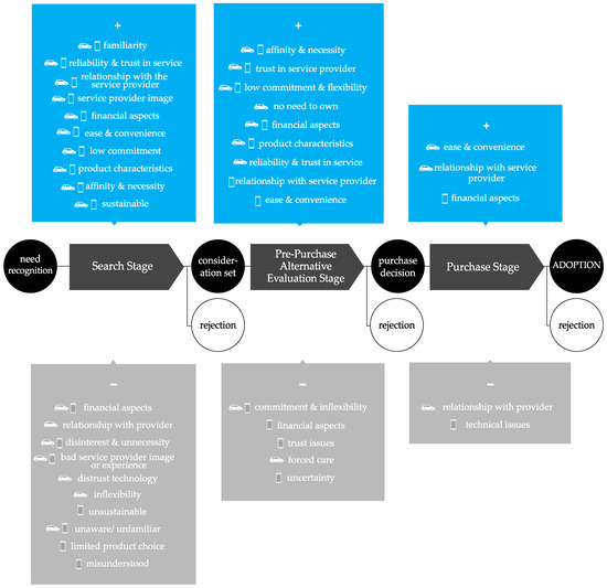 This sub-section only treats the answers of the interviewees who actually acquired the car or phone service. Themes mentioned more than twice are summarized in Table 5. Figure 3 shows a summary of the themes throughout the stages of the customer decision process during the acceptance phase.