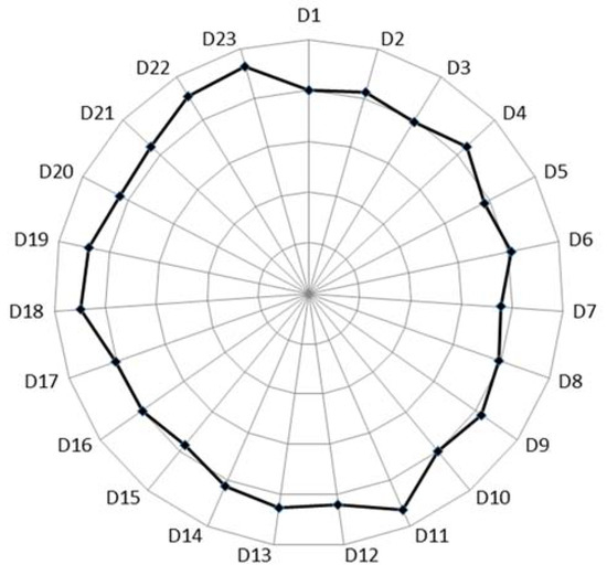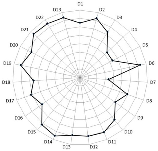 The most important index was the integrity of the accounting processes and contents of financial information according to laws and regulations (D23). The second most important index was the disclosure of the pollutants standardized discharge (D11). The following was the integrity of the contents and scope of the disclosure according to laws and regulations (D22). The next was the enterprise annual reports and environmental information audit opinions (D18). The last was the enterprise internal control system and its implementation (D19). What the appraisers considered significant were (D23), (D22), (D18), and (D19) as they are related to the environment in which the enterprise generates information, and the quality of the environment directly affects the integrity and accuracy of the information generated by the enterprise. If the environment in which the enterprise generates information is poor, the environmental accounting information disclosed by the enterprise will be invalid. Detailed disclosure of the pollutant standardized discharge (D11) clarifies the direct environmental impact caused by the production and operation of the enterprise. This is conducive to the supervision of enterprises by the public.