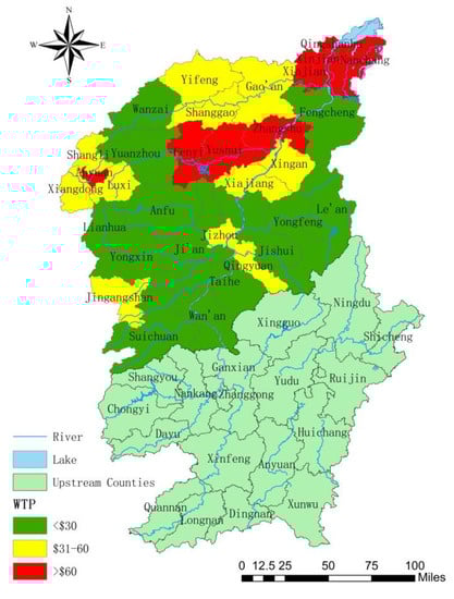 However, in the process of watershed ecological management, there are still some problems, such as the lack of public participation in some areas []. The Ganjiang River Basin is the most important river in Jiangxi Province []. This problem is especially obvious. The upstream of the Ganjiang River Basin is about 270.95 hectare (ha), and the annual ecological value is about $7996.33 per ha []. Meanwhile, the upper reaches of the Ganjiang River Basin are mainly concentrated in Ganzhou City, which is located in the south of Jiangxi Province. Ganzhou has an excellent ecological environment where the forest coverage rate exceeds 76%. However, the living standard of the residents is relatively low, and 8 of the 18 counties within the jurisdiction of Ganzhou City are designated as poverty-stricken counties at the state level. In addition, the water quality of the Ganjiang River Basin maintained a good level for a long time. In order to prevent the deterioration of water quality and further improve the ecological environment of the downstream area, the central and local governments continue to strengthen environmental protection to the upstream area of the Ganjiang River Basin, which limits the development of impoverished regions, and results in positive externalities. Although the government has paid a certain amount of compensation for the upstream, yet due to the lack of an effective compensation mechanism, the actual rights of subsistence and development of the upstream and downstream counties are different [], which leads to a contradiction between regional economic development and environmental protection in the river basin. As a terminal experience of the water resource allocation program, public support for the policy will ultimately effect its implementation []. According to the principle of “Who Benefits Whom Compensation”, the lower reaches of the Ganjiang River Basin should be paid as ecological compensation beneficiaries to make up for the benefits of the upper reaches to protect or improve the watershed ecological environment []. Although the Jiangxi provincial government has promulgated and implemented the compensation approach (Jiangxi Province Watershed Ecological Compensation Approach (Trial)), influenced by the promotion of “Jiangxi Example of Beautiful China”, the calculation of the ecological compensation funds of the river basin is mainly on account of the cost (i.e., construction and maintenance costs) of the upstream area to protect the river basin environment. The calculation method does not take market factors and public participation into account, and the estimated compensation for the smaller funds may lead to a compensation effect, which may not be fully apparent. Therefore, since the upstream residents and the government have been engaged in environmental protection of the river basin, the downstream residents should pay for the positive externalities derived from these activities. Thus, it is necessary to evaluate the willingness to pay (WTP) of the downstream residents. Willingness to pay is used as the basis of ecological compensation, which can effectively solve the above problems [], and it is also an important link for the construction of social and economic relations between upstream and downstream areas []. Additionally, it is helpful for the government to establish a watershed ecological compensation mechanism [].