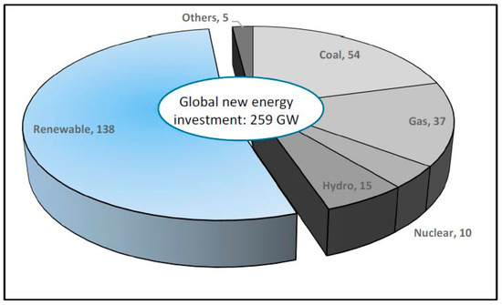 The abysmal Fukushima nuclear power plant accident occurred on 11 March 2011. Seven years later, due to this nuclear incident, most major countries have changed their paradigm toward clean and renewable energy. Switzerland’s nuclear energy share is 35% at present, but after several referendums from 1979, the country finally declared in 2017 that no more new nuclear plants would be built from 2019, and aimed step-by-step to achieve a zero-nuclear society by 2034. Germany had 17 nuclear power plants in 2011, but declared a zero-nuclear society by 2022. Italy also initiated a zero-nuclear policy by 2022. Of course, Japan is also considering a significantly lower share of nuclear power. Certainly, due to the Fukushima disaster, an increased renewable energy share has become core to the future challenge. New investment in clean energy reached the record figure of $360.3 billion in 2015, followed by $324.6 billion in 2016, and $333.5 billion in 2017. As shown in Figure 2, most of this investment went to renewable energy in 2016 [4].