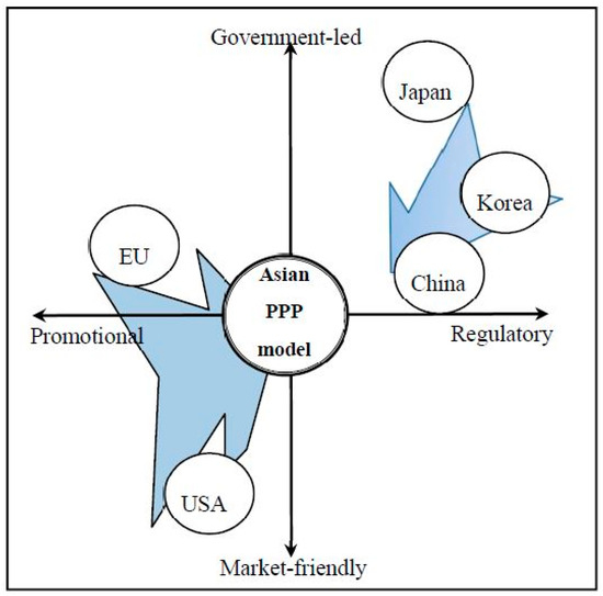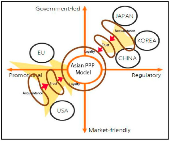 Figure 5 indicates that the northeast Asian countries are based on strongly government-led top-down environmental policies. As discussed above, however, such government-led policies may result in a consultocracy, with resulting policy failures, due to a lack of adequate business knowledge and market-oriented experience. Without the strong support of the private sector, it is almost impossible for governments to promote sustainable development. In 2018, for example, the Korean government faced unworkable recycling challenges with vinyl plastic materials. The Korean government implemented a volume-rate disposal system from the year 1995 that requires residents to purchase and use special trash bags [1]. All trash has to be disposed of in state-authorized plastic bags that were made available at local stores. However, the recycling of materials such as bottles, cans, and vinyl plastic bags is exceptional. These materials were free in terms of the consumers, because the producer’s liability (PL) law will pay a priori for these materials for recycling. However, due to the massive effort required for these recycling processes, the recycling companies claimed that they could no longer collect and process vinyl plastic, because most of the vinyl was too dirty and too sticky to clean and recycle, so the costs were ever-increasing. There are many reasons for this lack of governance with regard to vinyl recycling. One of the most important reasons arises from the consumers’ negligence in undertaking vinyl plastic waste disposal. Using the same system, Japanese people are very considerate in disposing of vinyl plastic bags. They clean most of the vinyl before they throw it out, making it easier for the recycling companies to decrease the effort required to handle the recycling process. The difference between Korea and Japan lies in the behavioral effectiveness of the population. Japan does not have any problem with the proactive participation of consumers, while Korean consumers think it is “none of my business”, and because it is free, they do not care about the disposal process. Therefore, the interrelationship between public and private sectors is very important to achieve better performance in environmental policies. This is the background of the Asian approach to these kinds of undesirable outcomes of environmental policies, in terms of Asian PPP models with the governance factor of loyalty as an Asian value.