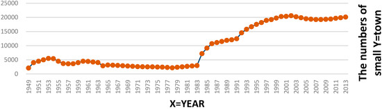 The quantity changes of small towns with the population of 2000 and above since 1949 (the foundation of the state). Data source: Urban and Rural Construction Statistical Bulletin in China [23].