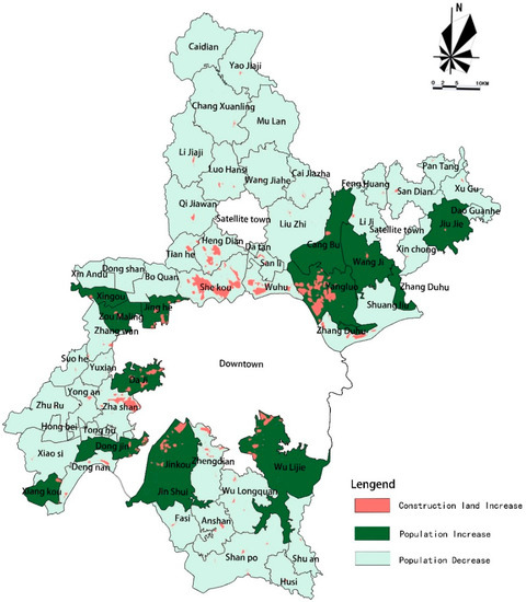 The differential of small towns in Wuhan. Data source of population: National Bureau of Statistics of the People’s Republic of China [26], draw by authors uses ARCGIS. Data source of construction land increase: The Research on the Development of Small Towns Report [27].