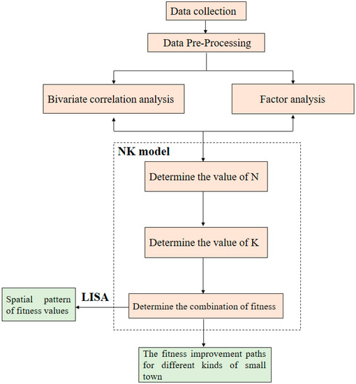 Data may affect the fitness of small towns will be collected according to CAS theory which is the theoretical basis of NK model in this paper. According to Holland’s echo model built on CAS theory and his interpretation on the adaptation mechanism of adaptive agents, the underlying reason for the differentiation lies in the adaptive capacity of the small towns. In other words, the lack of adaptive capacity makes the small towns fail to respond to their external environments, primarily the major cities’ snatches at their factors of production and the impact of rapid urbanization. In Holland’s view, an adaptive agent with high “fitness value” is able to maintain its capacity to draw on and process resources in their systems and to accelerate the evolution process in disregard of the changes or impacts of external environments [6]. Flow, one of CAS’ important characteristics, is essential to the adaptive capacity of small towns. It is used to identify whether the internal structure of an adaptive agent matches its function, and whether the fashion of matching allows the adaptive agent to persistently access to flowing factors. For small towns in an urban area, there are empirical studies that have proven the impact on the flow of production factors at diverse aspects, such as market, government, and geographic environment [28,29]. However, existing studies largely focus on empirical analysis and thus fail to quantitatively assess fitness about the small towns from an “adaptability” perspective [30,31,32].