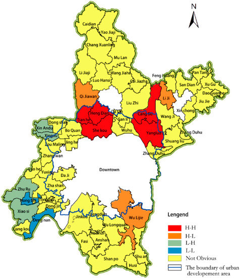 As shown in the figure, the H-H cluster consists of Hengdian, Shekou, Yangluo, Cangbu and Tianhe; the L-L cluster includes Hongbei, Dengnan and Tonghu; the H-L cluster comprises Qijiawan, Liji, and Wulijie; the L-H encompasses Xin’andu, Xingou, Zhuru, and Xiaosi. It is noticed that the high-level clusters are situated in the development area of the city. This indicates a significant difference in the spatial clustering of fitness between the area in and out of the development area.