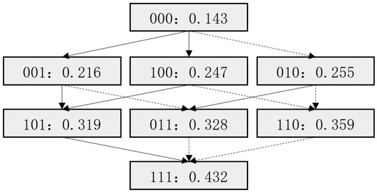 It can be seen from Table 8 that each small town corresponds to a fitness value and a combinatorial fitness state which are significant to arrive at the fitness improvement path. Especially for the small towns which belong to the type of locally adaptive and adaptive failure. In addition to fitness classification, the NK model can also be used to identify the paths from local to global optimum in different kinds of fitness landscapes. Without doubt, the NK computation results offer more than a solution to raise the level of fitness of each type of small towns. However, considering the intrinsic content and the corresponding degree of fitness of each combinatorial mode, the following are three optimal paths to improve the fitness of the small towns around the urban area in Wuhan (Figure 7).