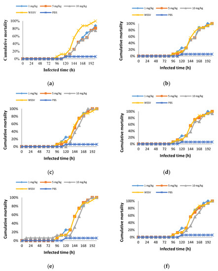 The cumulative mortality of the crabs is shown in Figure 3. The PBS group showed a cumulative mortality of 6%, while that of the WSSV group was 100% over 204 h of infection. At the end of 204 h, the final mortality rates of the experimental group injected with 1 mg/kg, 5 mg/kg, and 10 mg/kg S. fusiforme extract were 88%, 81%, and 75%, respectively. Crabs treated with I. okamurae (10 mg/kg) also survived, and the mortality rate was 94%. No surviving crabs were seen in the remaining experimental groups. Therefore, S. fusiforme extract significantly improved the survival of the WSSV-challenged crabs compared with the other seaweed species (p < 0.05).