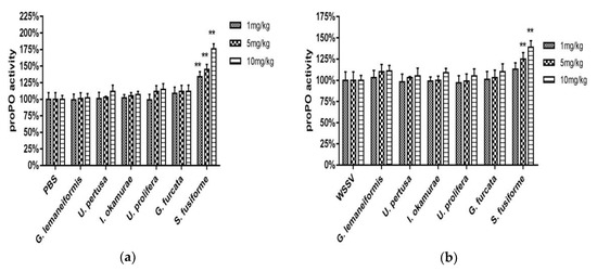 The proPO activity was measured in healthy (Figure 5a) and WSSV-infected crabs (Figure 5b) 24 h after the injection of seaweed extract. Among the healthy crabs, the proPO activity of those injected with seaweed extracts was higher than the PBS group, and directly proportional to the concentration of the extracts. The proPO values of crabs injected with S. fusiforme extracts were significantly higher compared with that induced by the other species (two-way ANOVA, F (6, 42) = 47.26, p < 0.01), and the highest activity was seen with 10 mg/kg S. fusiforme extract. Among the WSSV-challenged crabs, all of the test groups except for those injected with 1 mg/kg of U. pertusa, 1 mg/kg of I. okamurae, and 1 mg/kg and 5 mg/kg of U. prolifera exhibited higher proPO activity than the positive control group. The proPO values of crabs injected with S. fusiforme (5 mg/kg and 10 mg/kg) extract were significantly higher compared with the other species (two-way ANOVA, F (6, 42) = 11.78, p < 0.01).