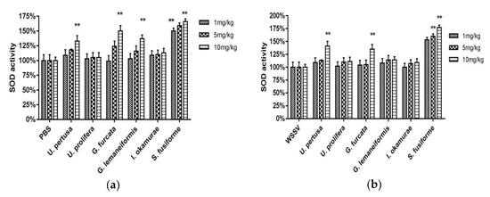 SOD activity was measured in the healthy (Figure 6a) and WSSV-challenged (Figure 6b) crabs 24 h after being injected with seaweed extracts. The SOD activity of healthy crabs injected with extracts of S. fusiforme (1 mg/kg, 5 mg/kg, and 10 mg/kg), G. lemaneiformis (10 mg/kg), G. furcata (10 mg/kg), and U. pertusa (10 mg/kg) were significantly high (two-way ANOVA, F (12, 42) = 4.404, p < 0.01), and that of the 10 mg/kg S. fusiforme-injected group was the highest. In the WSSV-challenged crabs, all of the seaweed extract-injected groups showed higher SOD values than the positive control group, and the highest SOD values were seen in crabs injected with S. fusiforme (1 mg/kg, 5 mg/kg, and 10 mg/kg), G. furcata (10 mg/kg), and U. pertusa (10 mg/kg) extracts (two-way ANOVA, F (12, 42) = 2.909, p < 0.01).
