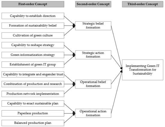 First, this study provides a qualitatively empirically grounded framework for the study of green IT [36,52]. Green IT is emerging as a topic and has received more and more attention from scholars [5,53]. However, most of these studies are generalized and lack empirical evidence. Without sufficient empirical evidence, the conclusions of these articles only stay in the hypothetical stage, which is not conducive to the accumulation of relevant knowledge. This study introduces the BAO model, introduces the process of a company’s transformation, and discovers the capabilities as well as actions required by the enterprise’s green IT transformation. The research findings enrich the research of green IT.