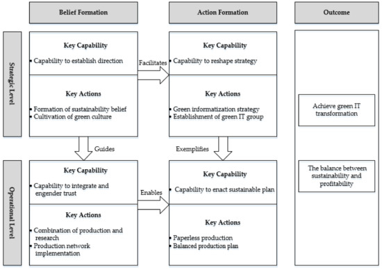 Second, this study contributes to the literature on sustainability from an IS perspective. Many researchers have suggested that corporate’s IT-driven sustainable transformation is very difficult to achieve, because corporate sustainability is a complex and multidimensional process that is full of uncertainty [5]. However, based on our inductively derived model, we find that companies develop key capabilities and key actions for belief formation and action formation at both strategic and operation levels. As far as we know, this study is one of the few studies that analyses sustainable development at strategic and operational levels within an organization based on a green IT perspective. Therefore, this study provides enterprises with actionable prescriptions to increase the possibility of successfully implementing green IT initiatives for sustainability.