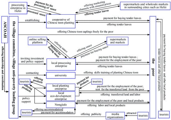 Since RT was deemed as an effective approach for poverty alleviation, the temporary anti-poverty leader was appointed to develop RTTAP in the village. However, the village did not have any attractive scenic spots. How to innovate RT development to attract tourists and increase the poor’s income thus became a puzzle. After a thorough investigation and survey, the leader thought that the RT development of the village should be based on Chinese toon. The reasons are as follows. Firstly, in spite of sparse planting, Chinese toon is a kind of traditional tree in the village, and it is also preferred for landscaping. Secondly, the characteristics of Chinese toon planting, including low cost, no strict skills requirement, and being seasonable thus just needing low labor intensity, make it very feasible and suitable for the village. As most of the young have left as migrant workers, those residents who remain are almost all old people and children who cannot afford much money or do work with strict skills or intense labor requirements. Thirdly, the tender leaf of Chinese toon is a kind of edible wild herb with rich nutrients and a therapeutic effect, meeting the needs of modern people for healthy food. Therefore, in 2014, the residents were called upon to plant Chinese toon and an integrated multiple industries network was gradually established during the development (Figure 1).
