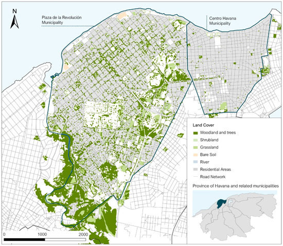 Acknowledging the importance of fine-scale assessment of highly heterogeneous and fragmented urban environments [30], we limit our assessment to two municipalities of the city, “Plaza de la Revolución” and “Centro Havana” in the northwest coastal area (Figure 1). These municipalities have clear differences concerning the urban morphology and population density (Table 1). Centro Havana, with the densest population in the country, was built in the 18th century after a densification process outside the walls of the historical city, resulting in a compact urban structure with the scarce presence of green spaces [31]. When the economic situation was buoyant after the First World War, immigrants with limited resources settled in Centro Havana, where the classical mansions were subdivided into single-rooms with shared bathroom and sanitary facilities in a common courtyard [32]. Currently, Centro Havana is one of the city’s municipalities with a major concentration of vulnerable population that are living in substandard housing or slum units, despite their having access to the same education, health care, job opportunities and social security as those who live in privileged neighborhoods [33]. On the contrary, Plaza de la Revolución, adjacent to Centro Havana, starts its urbanization in the 19th century to accommodate the sugar-plantation aristocracy and the middle-class from Centro Havana that were seeking a healthier environment [31,32]. Its urban morphology is characterized by a regular grid defined by tree-lined avenues, green verges, parterres and house gardens, while public green spaces replace entire blocks within the grid. Moreover, the metropolitan park of the city is located along the south-west limits of the municipality and the riverbank of the Almendares’ river.