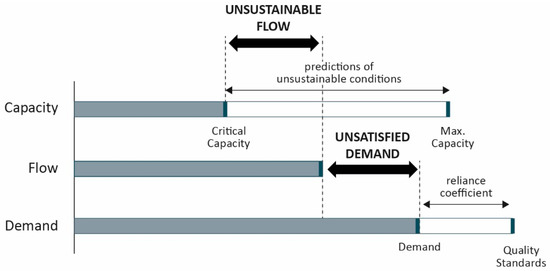 Conceptual diagram of mismatches. Capacity, flow and demand are measured in the same units of measurement. Quality standards are representative of ES demand. They are then reduced by a reliance coefficient. Critical capacity may rely on prediction of conditions of unsustainability and it is always lower than maximum capacity of green spaces. Unsatisfied demand occurs when ES demand is higher than ES flow. Unsustainable flow occurs when ES flow exceed critical capacity.
