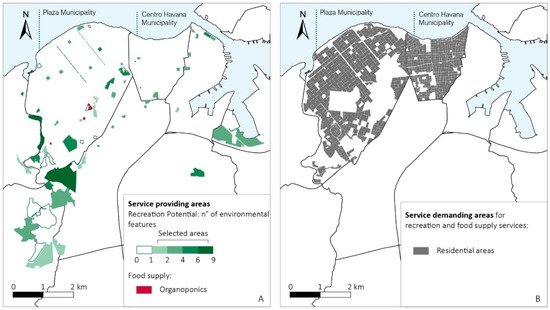 Map of service providing (A) and demanding areas (B) for recreation and food supply.