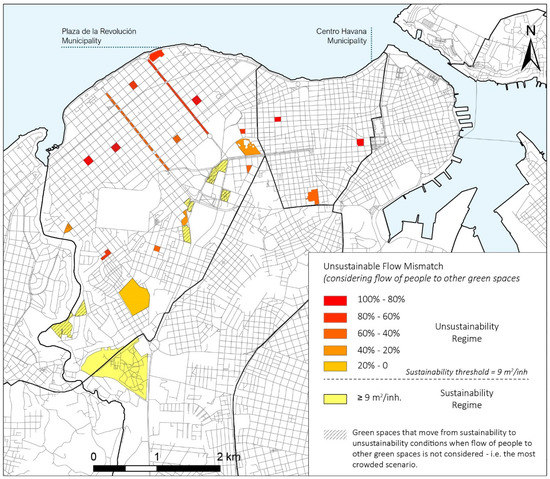 where: AGS is the area of the urban green space in m2; Nb is the number of beneficiaries; c the availability of recreational green space that each urban block has within maximum travel distances; and 9 m2/inhab, suggested in Cuban urban regulation. After quantifying the mismatch, we mapped urban green spaces in the condition of unsustainable flow, which is when a person has less than 9 square meters available within the recreational site—i.e., scenario of crowding. Then, we represented how much distant green spaces are from the sustainability threshold.