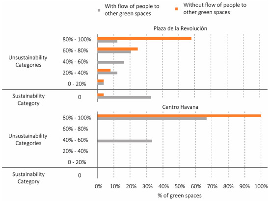 Figure 6 illustrates the results of unsustainable flow mismatch without considering the flow of people to other existing green spaces—i.e., the most crowded scenario. Our findings show that categories of “sustainable flow” and with “80–100% under sustainability threshold” are those that experience major changes for Plaza. Green spaces with sustainable flow decrease from 33% to 4% in the most crowded scenario (Figure 5). While green spaces with 80–100% under sustainability threshold increase by about 46% (11 green spaces in more). In the case of Centro Havana, changes occur within the unsustainability regime, e.g., increment by 33% of urban green spaces in the “80–100%” category.