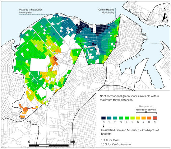 The unsatisfied demand mismatch for recreation varies among municipalities because of their urban morphologies, e.g., in Plaza it promotes the integration of green areas, in Centro Havana there is a disproportionate ratio between service demanding and providing areas. Particularly, in the latter municipality, the recreation potential of green spaces that are located outside play a crucial role in satisfying the demand. We also found that, in both municipalities, dwellers of residential areas already benefiting from recreation do not have to travel long distances to reach the green space. Several studies suggest that distance from green spaces is inversely associated with use and physically active behaviors [54].