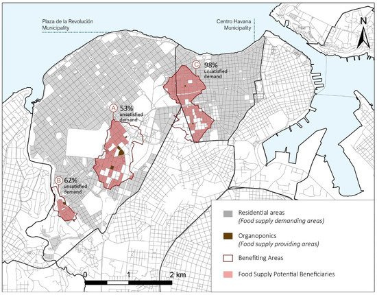 Based on the accessibility map, we identified two areas in Plaza with access to organoponics within 500 m (A and B, see Figure 8) hosting 9.6% and 1.6% of the municipality population. In 2016, the total production of Plaza’ organoponics was not enough to satisfy the demand. In fact, unsatisfied demand for A and B ranges from 53% to 62% of potential beneficiaries, respectively, while at the municipal scale, it reached 95% of the population. In the case of Centro Havana, the results are even worse, reaching 99.5% of unsatisfied demand at the municipal level. The two organoponics that are available in this municipality create just one benefiting residential area. Although a relevant share of population lives in this area (22% of total population), local organoponics have satisfied demand for only 2.2% of these residents in the 2016.