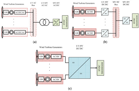High voltage direct current (HVDC) configurations for wind power transmission: (a) DC-based connection with two-stage hybrid conversion; (b) DC-based connection with two-stage DC/DC conversion; (c) DC-based connection with the proposed modular converter.