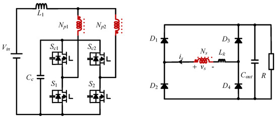 The basic cell topology based on CFPP converter shown in Figure 2 has similar operation principles and characteristics as the converter presented in Reference [27]. S1–S2 are the two main switches. Sc1–Sc2 are the two active clamping switches. Cc is the clamp capacitor. L1 is the input transistor. The tri-winding transformer has a turns ratio of Np1:Np2:Ns = 1:1:n and leakage inductance Lk at the secondary side. Furthermore, the secondary circuit consists of four rectifier diodes D1–D4, one output capacitor Cout and a load resistor R.