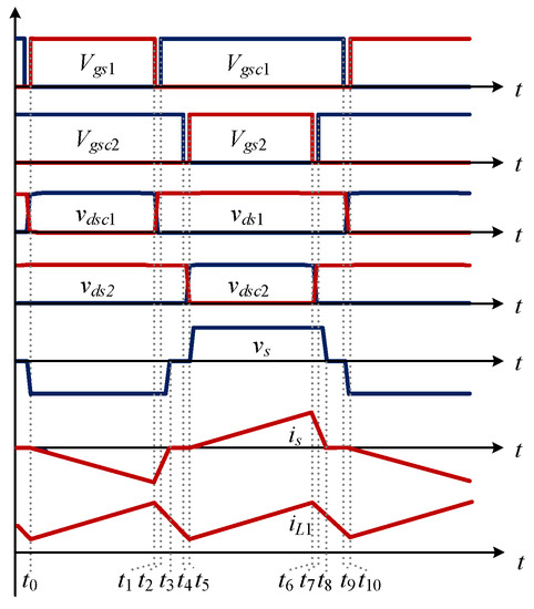 The key operating waveforms of CFPP cell are depicted in Figure 3. Vgs1–Vgs2 are the control signals for the two main switches S1–S2, which have the phase shift angle of 180°. Vgsc1–Vgsc2 are the control signals for the two clamp switches Sc1-Sc2. The control signals of the main switches and clamping switches are complementary. vds1–vds2 and vdsc1–vdsc2 are the drain-to-source voltages of the main switches and clamping switches respectively. iL1 is the current of input inductor L1. vs and is are the secondary voltage and current of the transformer respectively. The following assumptions are made to simplify the analysis.