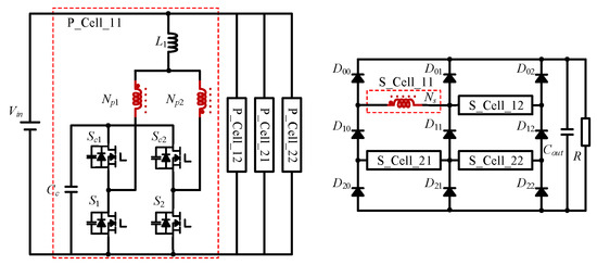 A fundamental 2 × 2 modular topology is presented in Figure 4. The primary circuits of power cells are parallel connected so that they have an equal secondary voltage value with the same duty cycle of main switches. The secondary side of each cell is connected with four rectifier diodes for power regulation.