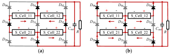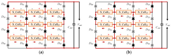 The control complexity is reduced by the auto-balanced currents of cells in the same column. According to the currents through diodes D10–D13 and D20–D23, as shown in Figure 7, the relationships among all cells can be obtained as: