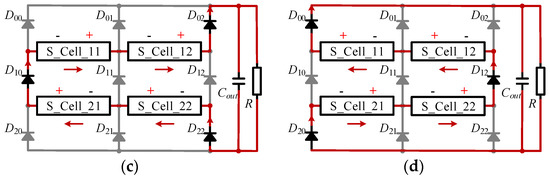 From Figure 5c,d, in series interleaved modes, all cells are series-connected. The cells in adjacent rows have the opposite polarities while the cells in the same row have the same polarity. Similar to Equation (4), diodes D10 and D12 have twice the voltage rating higher than that of diodes in the first and last rows because they connect with two rows. The currents of all operating diodes have the same value since they are in series-connection. Hence, the voltage and current ratings of diodes in series interleaved modes can be calculated as: