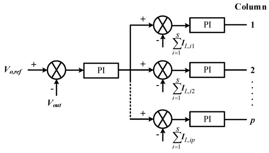 According to Equation (12), the average currents for cells in the same column are auto-balanced. Therefore, as shown in Figure 8, only the control of output voltage and current sharing in different columns is employed to achieve the required output voltage and power in the s × p topology, where vo,ref is the desired output voltage and iL,i1–iL,ip are the currents collected from columns 1–p.