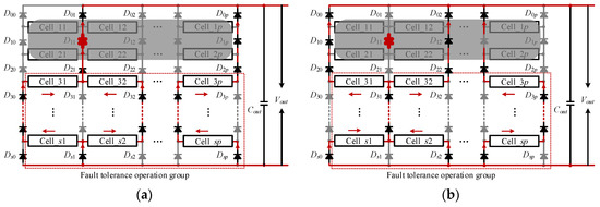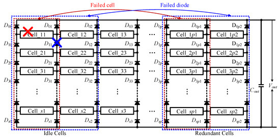 Figure 9 shows the fault tolerance operation derived by installing redundant power cells. To maintain normal operation, the column in a red dotted box containing the damaged Cell 11 is replaced by one redundant column that is in the other red dotted box. For the faulty diodes D00–Ds0, they require only one redundant column since they connect with one column. However, for other diodes, two redundant columns are demanded. For example, when diode D11 fails, the columns 1–2 in the blue dotted box are idle, and the redundant columns p1–p2 are applied.