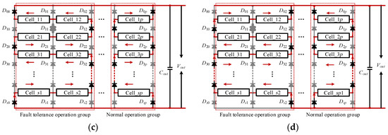 The proposed topology can also obtain fault tolerant operation of diodes and power switches without redundancy. In Figure 10a,b, when diode D11 is short-circuited, the cells in rows 1–2 are inactive to block the faulty components, while the fault tolerance group still operates with the column interleaved strategy. Additionally, to maintain normal operation, the output voltages of the faulty group are controlled according to Equations (2) and (9) to ensure the output voltage is the same as that in the normal case. When diode D11 is open-circuited as illustrated in Figure 10c,d, the fault tolerant operation group consisting of two columns works under the series interleaved modes to block D11. Compared with the normal operation group, the number of cells in series connection in the faulty group is doubled. The voltages of cells in the fault group are adjusted as illustrated in Equation (15) to ensure they have the same terminal voltage.