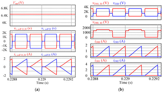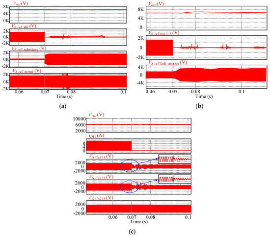 Figure 15a shows the fault tolerance operation with redundancy. At 0.07 s, fault cells 1–2 are idle, and the redundant columns 4–5 start to work to guarantee normal operation. Figure 15b,c presents the fault tolerance without redundancy, where only columns 1–3 are active. In Figure 15b, when the diode D11 is short-circuited, the cells in rows 1–2 are blocked. The voltages of cells in row 3–4 are doubled to achieve the same terminal voltage. The diode D11 is open in Figure 15c. The faulty group consisting of columns 1–2 works in the series interleaved mode by changing the polarities of cells. Moreover, the voltages of cells in the faulty group are reduced to half of that in the normal operation group to obtain the same output voltage.