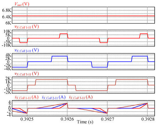 For Figure 12, every group has different numbers of rows. Only one row operates in Group 1; in Group 2, there are two rows; Group 3 has four rows. The duty-cycle D of cells in each group is regulated to obtain the same terminal voltage, and the voltages of cells are shown in Figure 12 as: Vs_cell 1–11 = 2 × Vs_cell 2–11 = 4 × Vs_cell 3–11 = Vout.