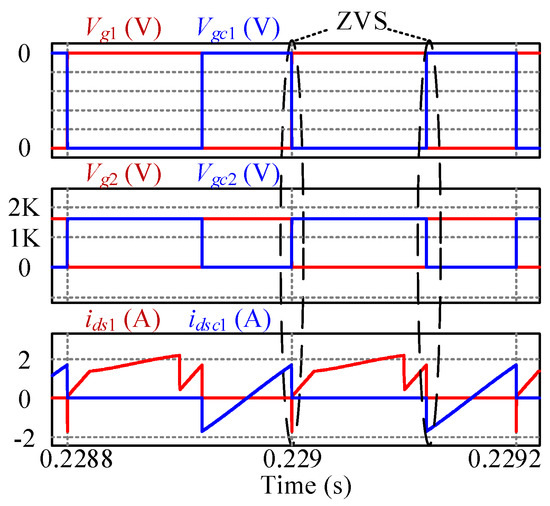 As illustrated in Figure 14, before turning on switches S1 or SC1, the drain-to-source current flows through the parasitic diode of the switch to achieve ZVS operation. Similarly, the switches S2 and SC2 can also obtain soft-switching. Therefore, the switching loss is significantly reduced.