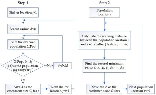 Step 1: The first step is to identify the service facility catchment. For each shelter location j, search all population location points within a predefined initial search radius d0 and count the total evacuee population. If the total evacuee population is greater than or equal to the population capacity of shelter location j, then the search radius d0 is the catchment size (Cj) of shelter point j. Otherwise, the search radius d0 is incremented by a small amount Δd and the process is repeated until the total evacuee population within the new catchment size reaches the population capacity of shelter location j. The new catchment size (Cj) is then saved for the shelter location j.