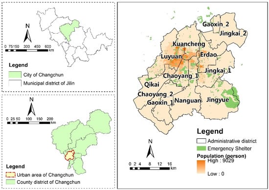 Location of the study area and the spatial distribution of population and emergency shelters in Changchun.