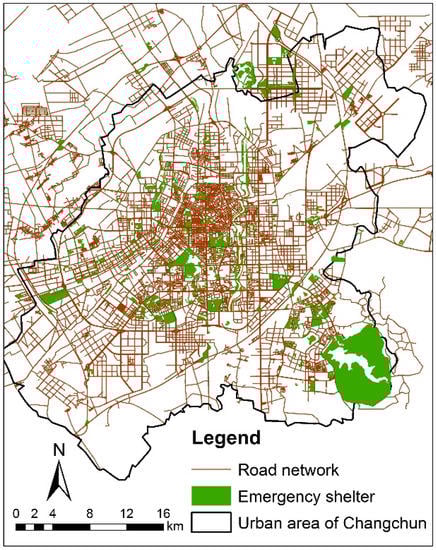 The distribution data of emergency shelters in Changchun (Figure 2) were visually interpreted by the Google Earth image in 2016, based on 47 public shelters announced by the Seismological Bureau of Changchun (http://ccdzj.changchun.gov.cn). The data include the shelters surrounding the study area, which would provide service for the evacuee. The shelter facilities include parks, public squares, large parking lots, large stadiums, school playgrounds and open green space in communities or streets, excluding the water areas. The population capacity of each shelter was calculated by the effective shelter area requirements in Table 2 with the consideration for the storage area required for emergency relief materials (30 m2 per thousand people) [7,49]. Finally, we converted the shelter polygon data into geometric center point data with the attributes of population capacity and area size, to apply those data to the evaluation of shelter accessibility.