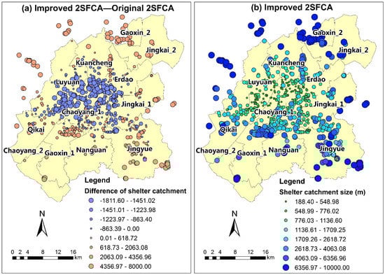 (a) Differences in shelter catchment sizes between the improved 2SFCA method and original 2SFCA method; (b) Catchment sizes of the emergency shelters in the improved 2SFCA method.